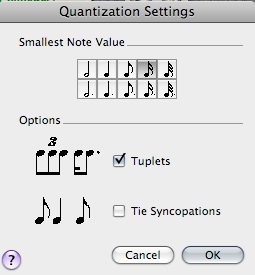 Quantization Settings määrittää lyhyimmän tunnistetun nuottiaika-arvon silloin, kun nuotit äänitetään MIDI-soittimella. Smallest Note Value valitaan sen mukaan, mikä on lyhyin soitettava nuotti. Monesti se on 1/8-nuotti. Jos arvon valitsee liian pieneksi, on lopputuloksena lyhyitä taukoja vilisevä nuotti. Liian pitkä aika-arvo ei erota peräkkäisiä nuotteja toisistaan vaan kasaa ne intervalleiksi tai soinnuiksi.