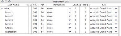 Seuraavalta palstalta voi valita viivaston MIDI-kanavan, ja mikäli on tarpeen, voidaan valita MIDI-soitin jostain eri pankista. Program Change-palstalta voi soundin valita numeron perusteella ja GM-palstalta nimen perusteella.