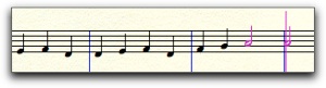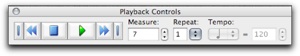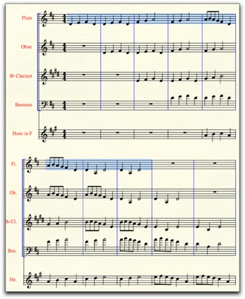 Kopioidaan sitten melodia kaanoniksi muille soittimille. Aktivoi valintatyökalulla ensimäinen tahti ja sitten vaihtonäppäin pohjassa viimeinen tahti. Koko melodia muuttuu sinipohjaiseksi. Siirrä sitten melodia muille soittimille tahdin välein. Huomaa, että NotePad transponoi stemmat tarvittaessa kirjoitettuun sävellajiin sekä lisää kappaleen loppuun tahteja. Jos haluat katsella nuottia in C, valitse Document-valikosta Display in Concert Pitch. Playback Contol -ikkunassa on soittopainikkeet, joiden avulla kappaletta voi soittaa ja kelata.