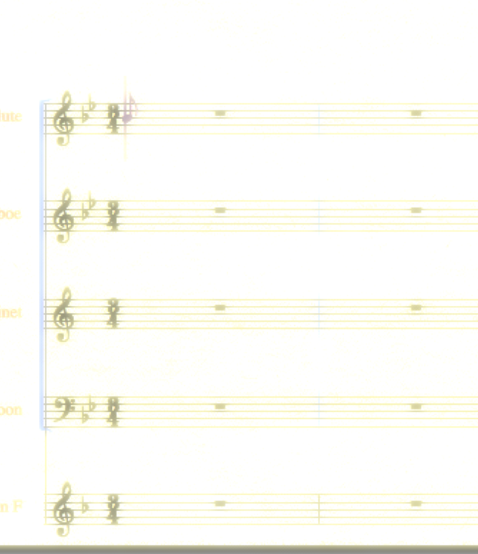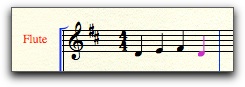 Paletin käyttö on suoraviivaista, klikataan haluttua aika-arvoa ja laitetaan nuotti viivastolle. Valitse 1/4-nuotti ja kirjoita Jaakko kullan ensimmäinen tahti huilulle. Enempää ei kannata kirjoittaa, vaan käytetään kopiointia. (Jos tulee virhe, voi käyttää pyyhekumia korjaamiseen - tai Undo-komentoa Edit-valikosta.)