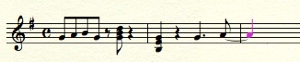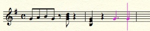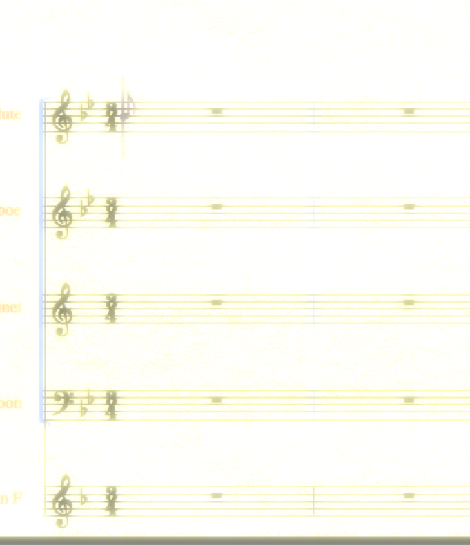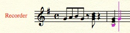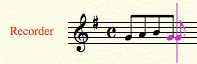 Mikäli haluat tauon, käytä numeroa 0. Tässä tapauksessa nuottiin ilmestyy 1/8-tauko. Intervalli tai sointu saadaan pääsävelen yläpuolelle käyttämälä kirjainnäppäimistön numeroita (3 = terssi yläpuolelle, 4 = kvartti, shift-3 = terssi alapuolelle). Onnistuisiko seuraava fragmentti? (Nokkahuilisti ei ainakaan sitä osaa soittaa.)