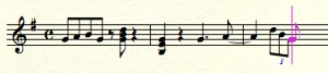 Lopuksi vielä kromatiikkaa. Valitse sekä aika-arvo että kromaattinen merkki ja kirjoita nuotti. Jälkeenpäin voi kromaattisen merkin lisätä siten, että valitsee merkin ja osoittaa kursorilla nuotin nuppia.