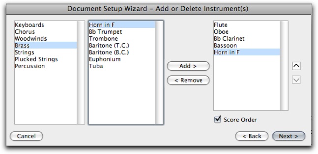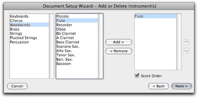 Nyt on vuorossa partituurin soittimien valinta. Add or Delete new Instrumet(s) -ikkunassa on kolme kenttää. Vasemmasta reunasta valitaan ensin haluttu soitinperhe, keskimmäisestä kentästä poimitaan tarvittava soitin ja oikeaan kenttään ilmestyy partituuŕijärjestys.