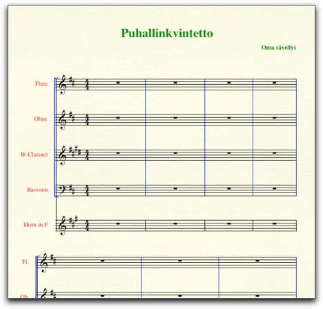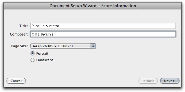 Nuottipohja tehdään kolmessa vaiheessa, joista ensimmäisessä annetaan kappaleelle nimi. Ota ohjelman File-valikosta New-komento, avautuu Score Information -ikkuna. Tehdään oma puhallinkvintetto, joka muistuttaa kovasti Jaakko kulta -kappaletta. Täytä kentät esimerkin tapaan.