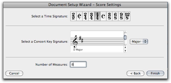 Seuraavaksi valitaan vielä tahti- ja sävellaji. 4/4 ja D-duuri sopivat tällä kertaa. Tahtimääränkin voi valita etukäteen - kahdeksan riittää tähän harjoitukseen. Tahtimäärää voi toki muuttaa myöhemminkin.